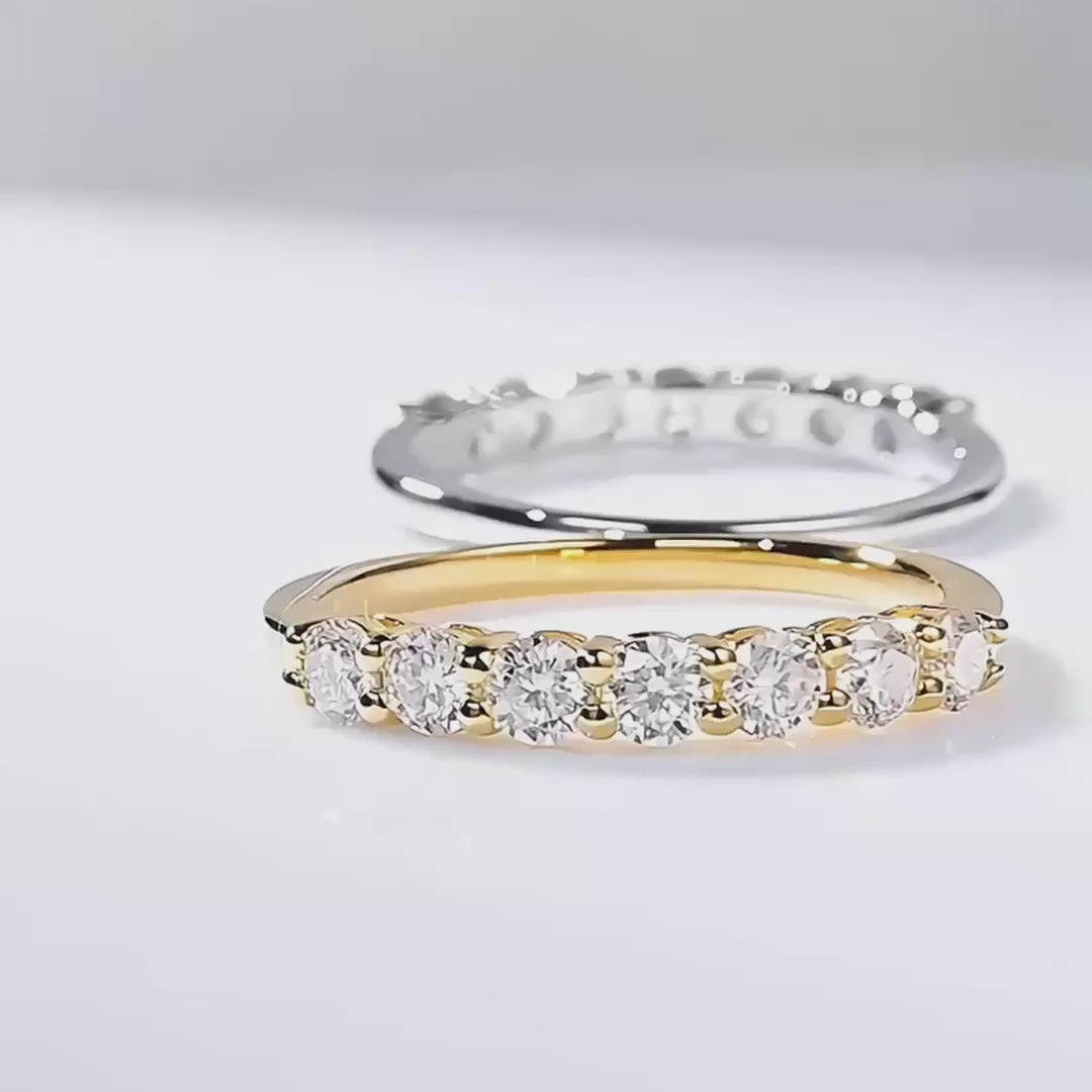 Crafted in 18k yellow gold–plated sterling silver, this half-eternity ring features a line of round brilliant-cut moissanites, each meticulously set to shimmer with enduring brilliance. Choose between five or seven stones for just the right amount of radiance.