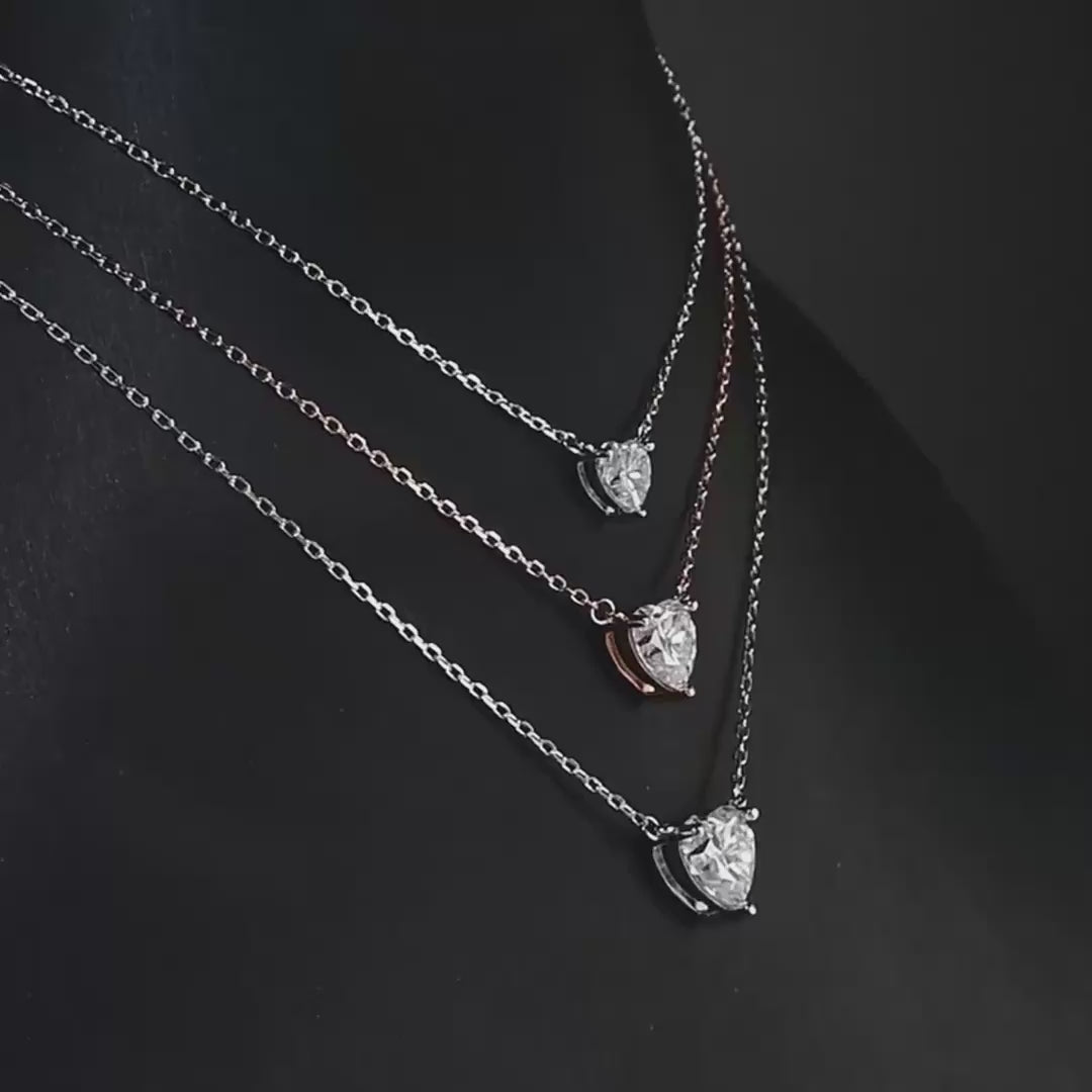 Crafted in 925 sterling silver with your choice of 18k white, rose, or yellow gold plating, this elegant necklace features a heart-cut moissanite that captures light from every angle. The brilliant D-color stone sits gracefully on a delicate cable chain, offering a touch of sentiment without the sentimental price tag.
