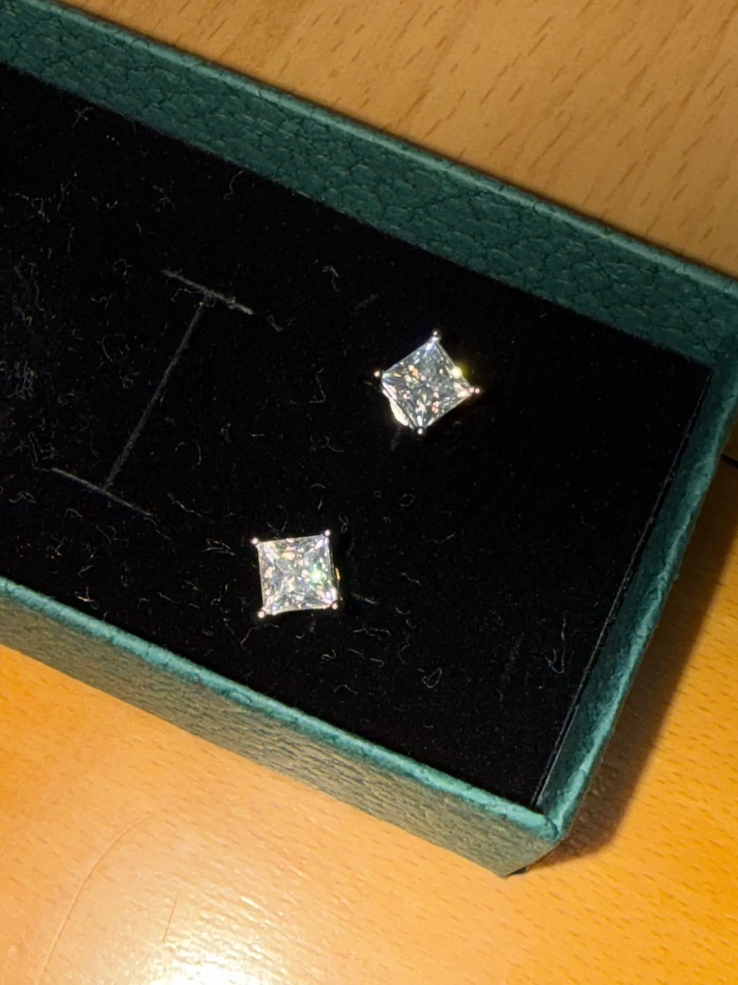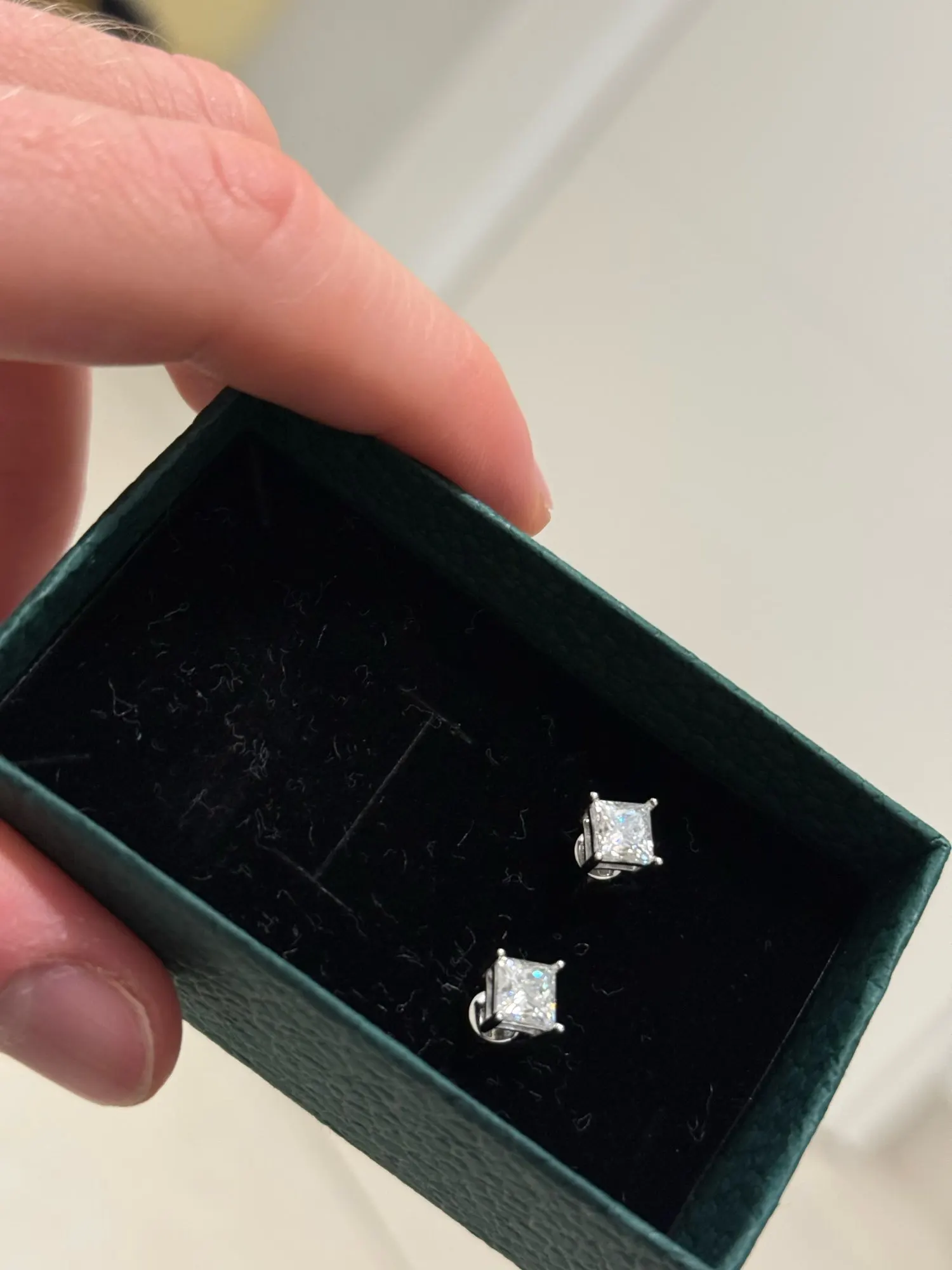 Crafted in 18k white gold–plated 925 sterling silver, these chic earrings feature a crisp princess-cut moissanite that catches the light with every turn. The square silhouette gives a sharp, contemporary feel — perfect for the fashion lover who wants effortless sparkle without the luxury markup.