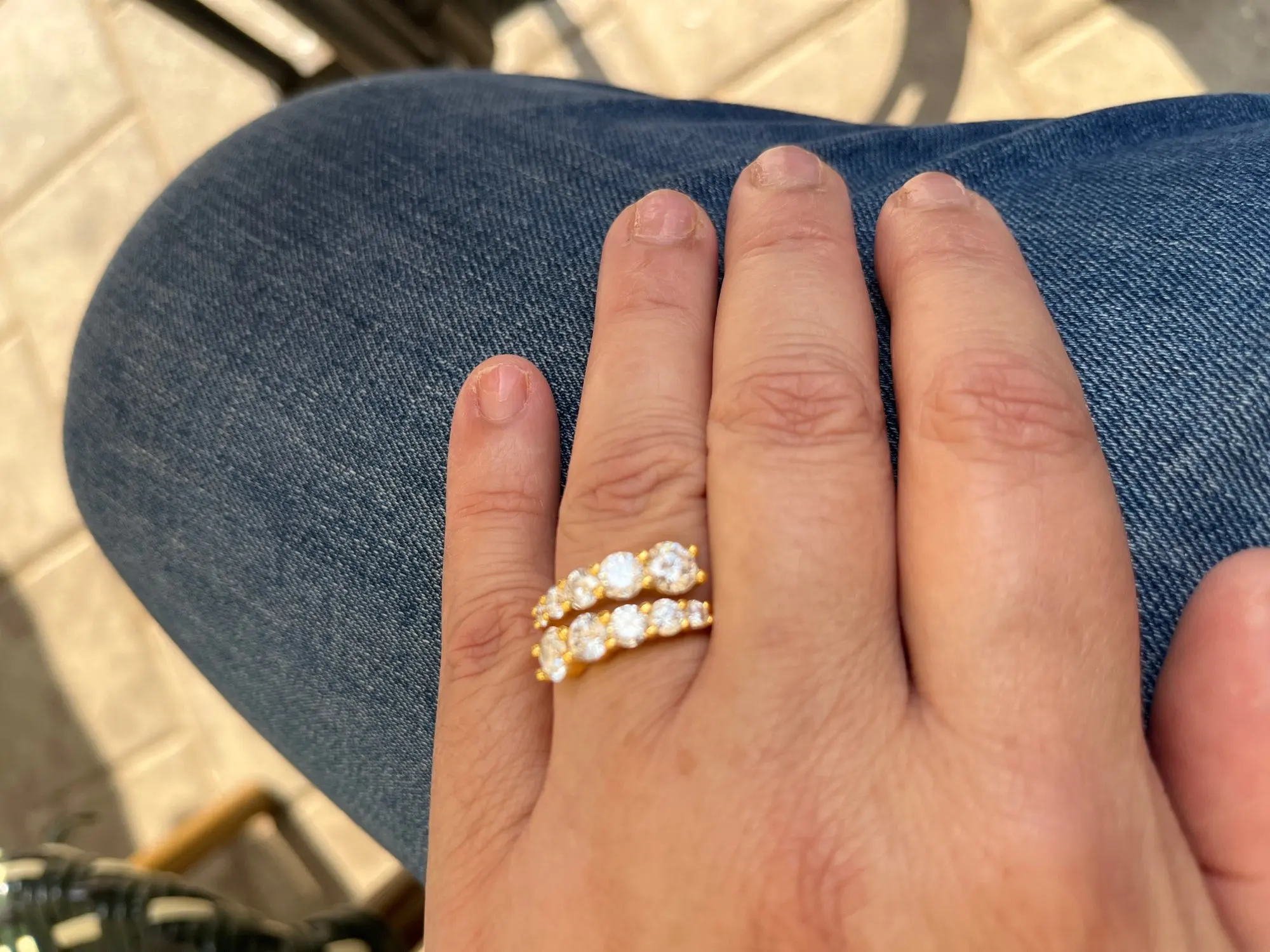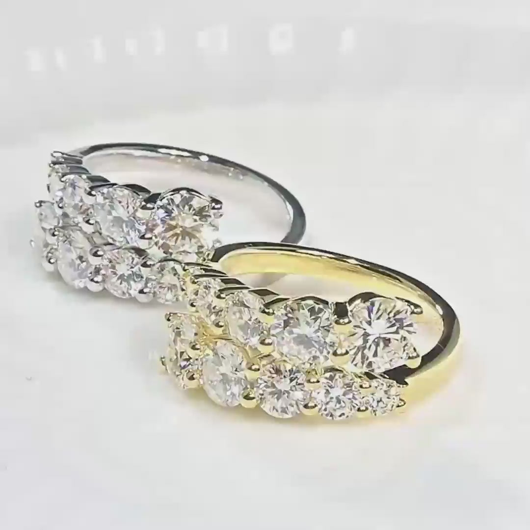 Crafted in 18k gold–plated sterling silver, this double-row ring showcases a cascade of round brilliant-cut moissanites, each one hand-set to capture the light with mesmerising brilliance. The graduated stones create a graceful flow of sparkle, blending strength and femininity in perfect balance.