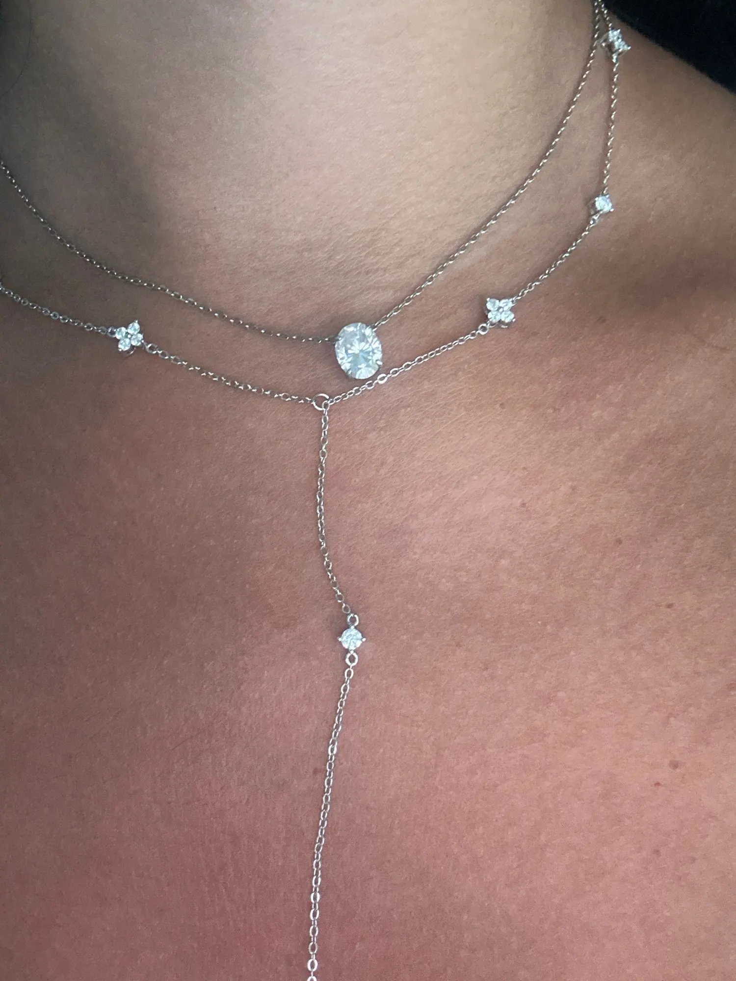 - Design: Lariat/Y-shaped necklace with scattered station stones